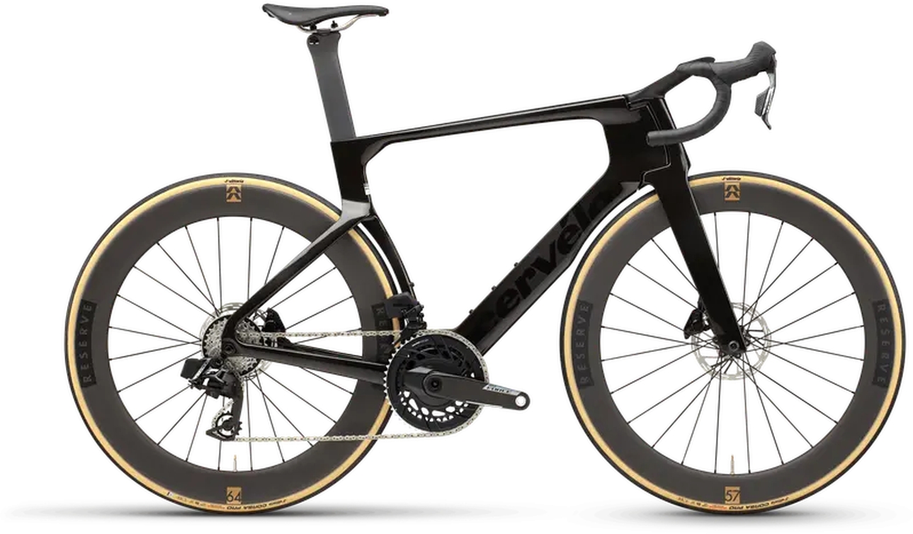 Silniční kolo Cervélo S5 které je celosvětovým sportovním měřítkem rychlosti a aerodynamické efektivity. Společnosti Cervélo a Reserve společně vyvinuly nová karbonová kola Reserve 57|64 Turbulent Aero speciálně pro použití v rámu S5. S elektronickou bezdratovou sadou Sram Force AXS E1 2×12.