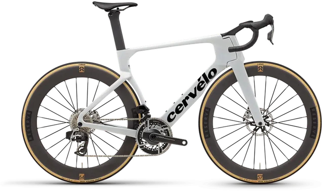 Silniční kolo Cervélo S5 které je celosvětovým sportovním měřítkem rychlosti a aerodynamické efektivity. Společnosti Cervélo a Reserve společně vyvinuly nová karbonová kola Reserve 57|64 Turbulent Aero speciálně pro použití v rámu S5. S elektronickou bezdratovou sadou Sram Red AXS E1 2×12.