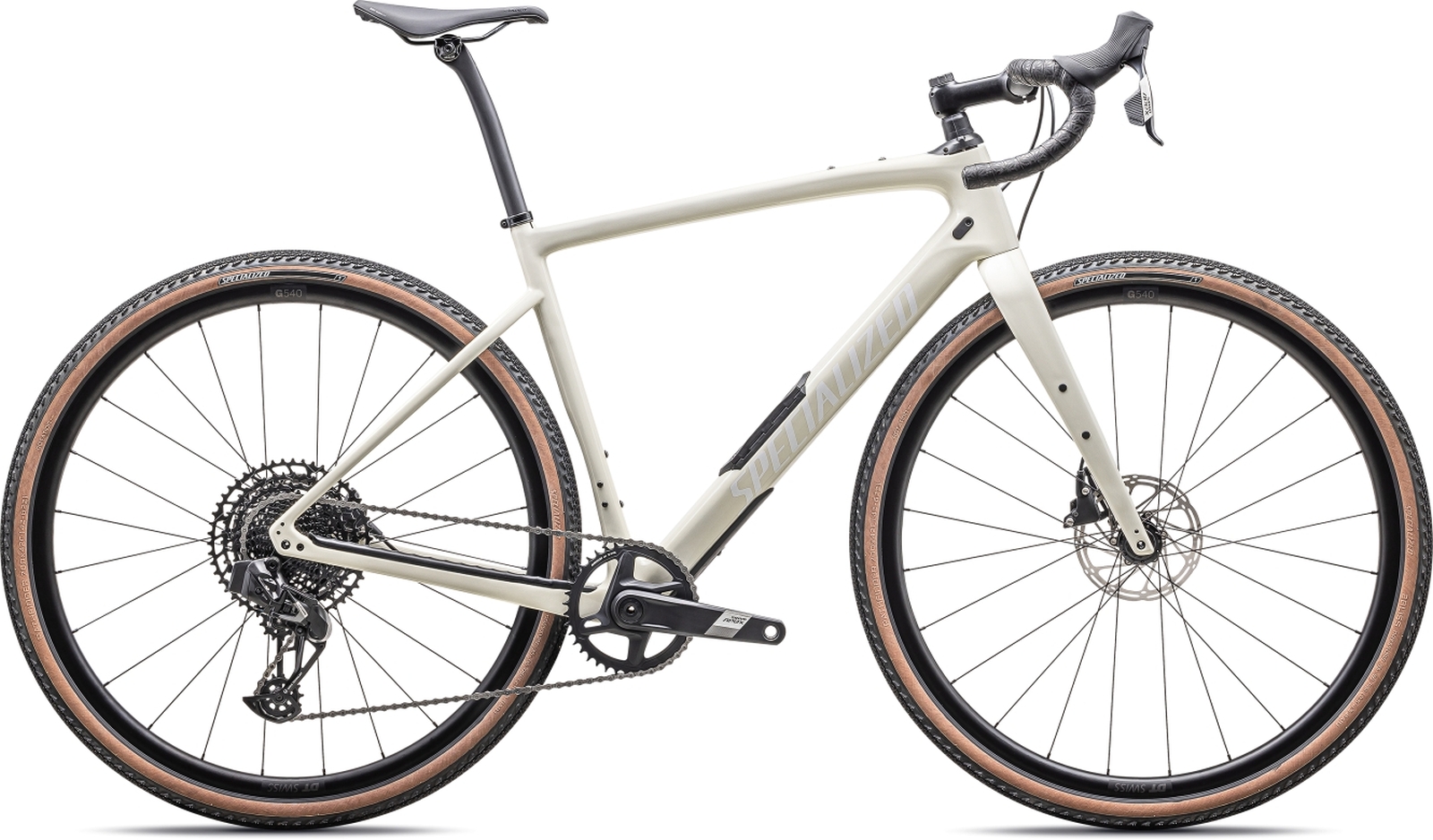 Gravel kolo postavené na lehkém karbonovém rámu FACT 9r, osazené bezdrátovou elektronickou sadou Sram Apex AXS 1×12 a vybavené odpruženým kokpitem Future Shock 2.0 pro hladký průjezd po rozbitých cestách.